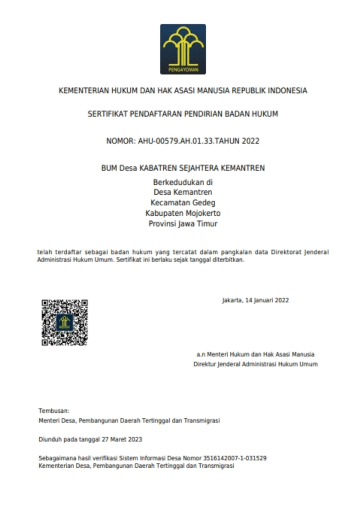 • Perdes nomor 23 Tahun 2021 Tentang Badan Usaha Milik Desa Kabatren Sejahterah Kemantren kewenangan dalam pengolahan sampah .